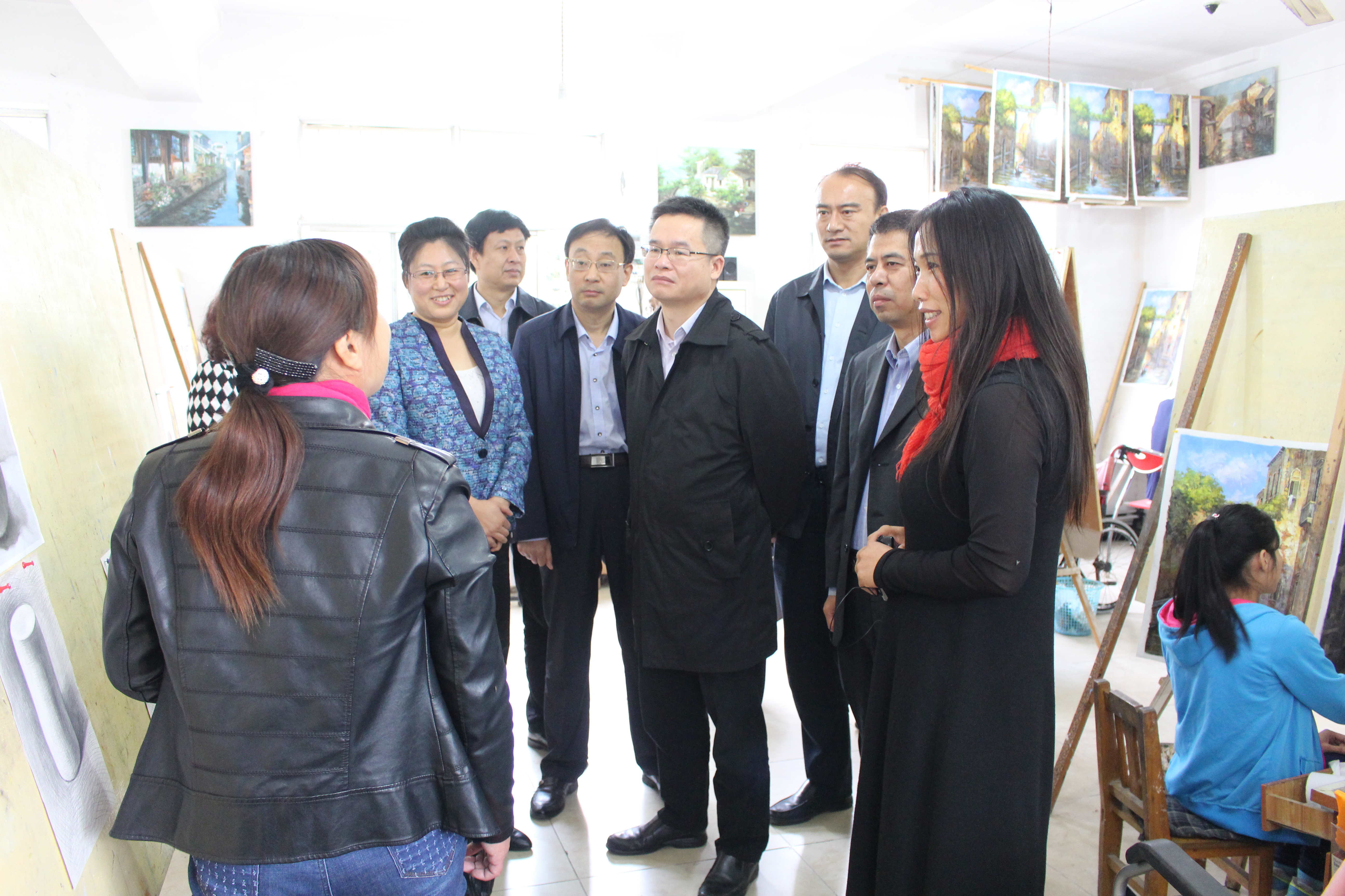 10月20日,中国残联宣文部主任郭利群来我县调研残疾人文化产业工作。县领导焦卫星、陈淑平及省市残联领导陪同。 郭利群一行来到平阴绿泽画院进行了实地查看,先后参观了残疾人油画工作室、我的兄弟姐妹油画展厅、石雕作品展厅以及石艺雕刻室,并对画院残疾学员情况、教学方式、产业运作模式等情况进行了详细询问和了解。他对残疾学员们的绘画及石雕作品连连称赞,对他们身残志坚并用自身故事深表敬佩。同时,对画院残疾人就业培训模式给予了高度评价。 近年来,画院已培训残疾人280多人,集中安置帮扶100余名残疾人实现就业。绿泽画院在现有基础上将建设500平方米的残疾人综合培训室,建设3000平方米的残疾人美术展览馆,展出残疾人油画及石雕作品,将平阴绿泽画院努力打造成国家级残疾人文化产业培训就业基地,安置残疾人200名。