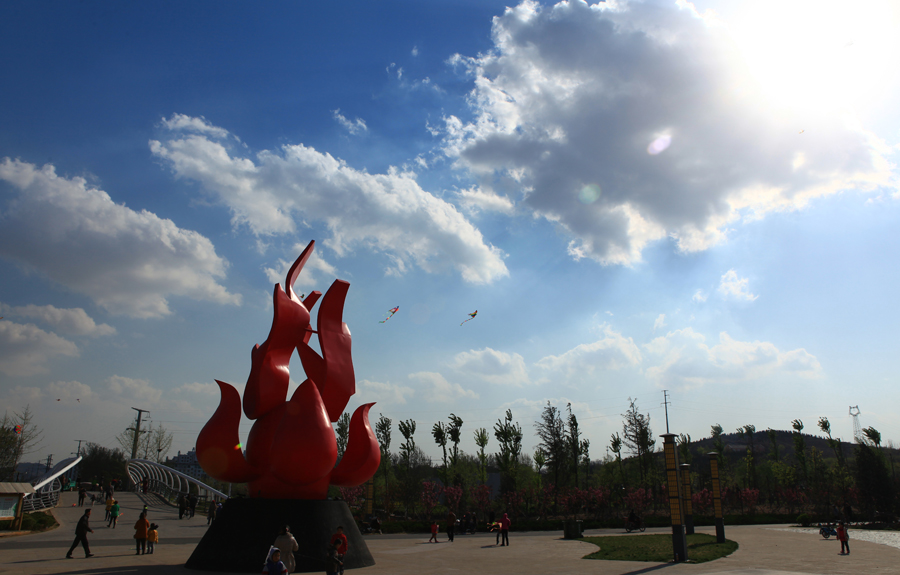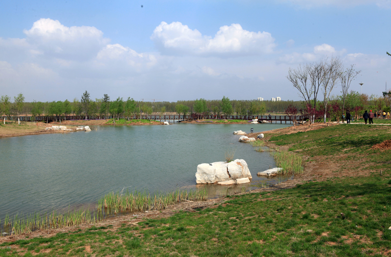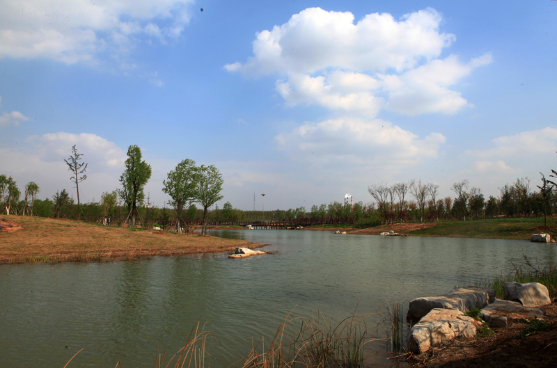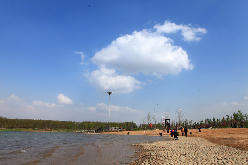 受冷空气影响,2015年4月12日,山东平阴玫瑰湖湿地公园上空蓝天白云。