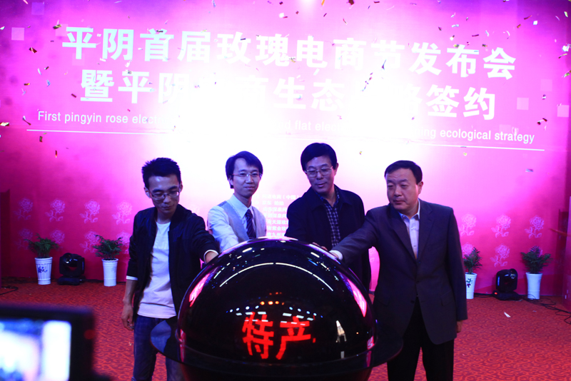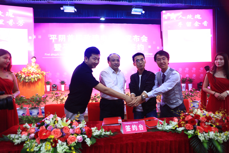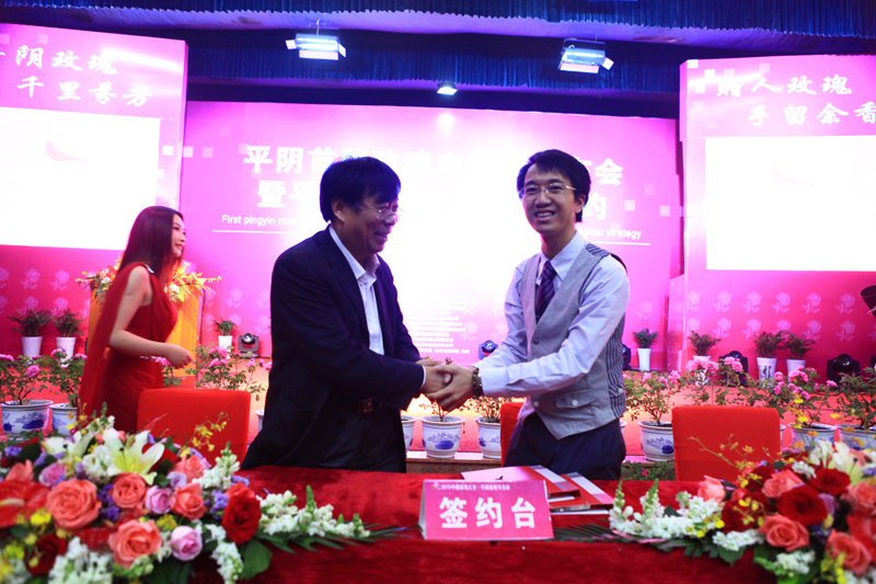 4月30日是,首届平阴玫瑰电商节发布会暨平阴电商生态战略签约仪式在玫苑会堂举行,平阴玫瑰与店商首度合体,迎来“互联网+”时代。京东、拍拍、嘉诚优品等店商平台嘉宾论剑互联网+平阴玫瑰,签订战略合作协议,并与玫瑰加工企业负责人、与会微商等共同见证了京东平阴馆和拍拍山东特产专营店同步上线。