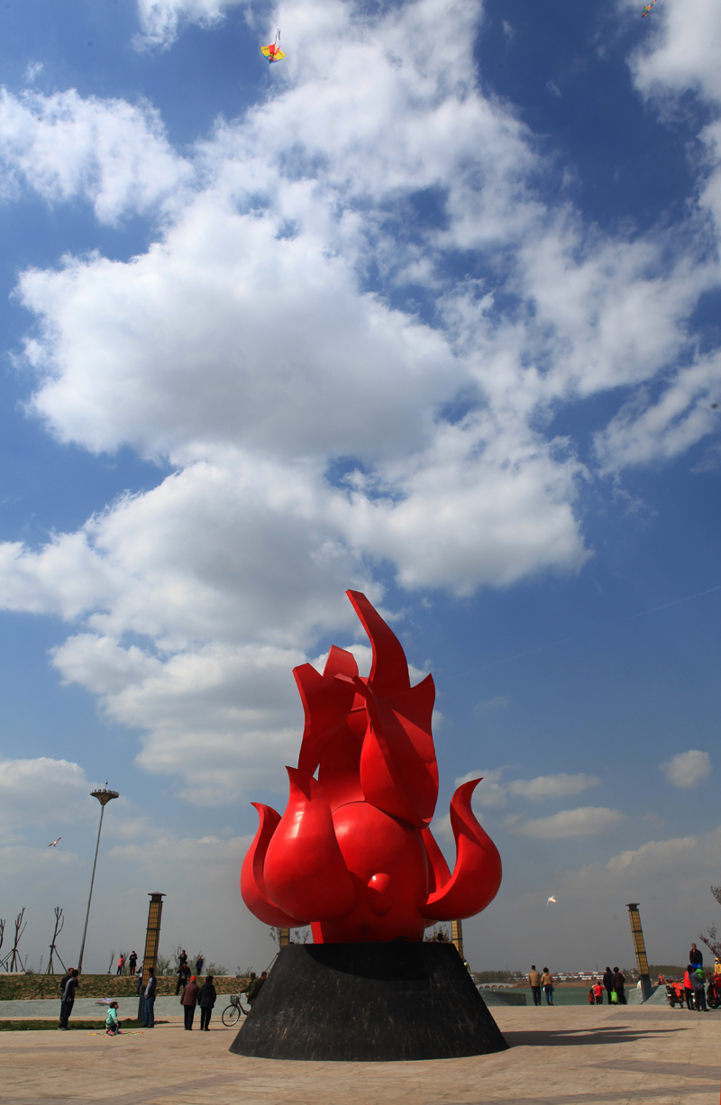 受冷空气影响,2015年4月12日,山东平阴玫瑰湖湿地公园上空蓝天白云。